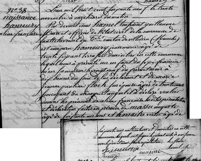 Sur la ligne Caen–Paris, Jean-Marie et Marie s’installent au gré des chantiers. En novembre 1869, à Saultchevreuil-du-Tronchet (aujourd’hui Villedieu-les-Poêles), naît leur sixième enfant : Aline.
